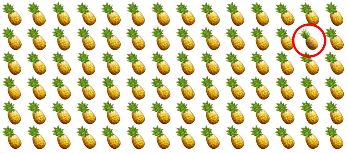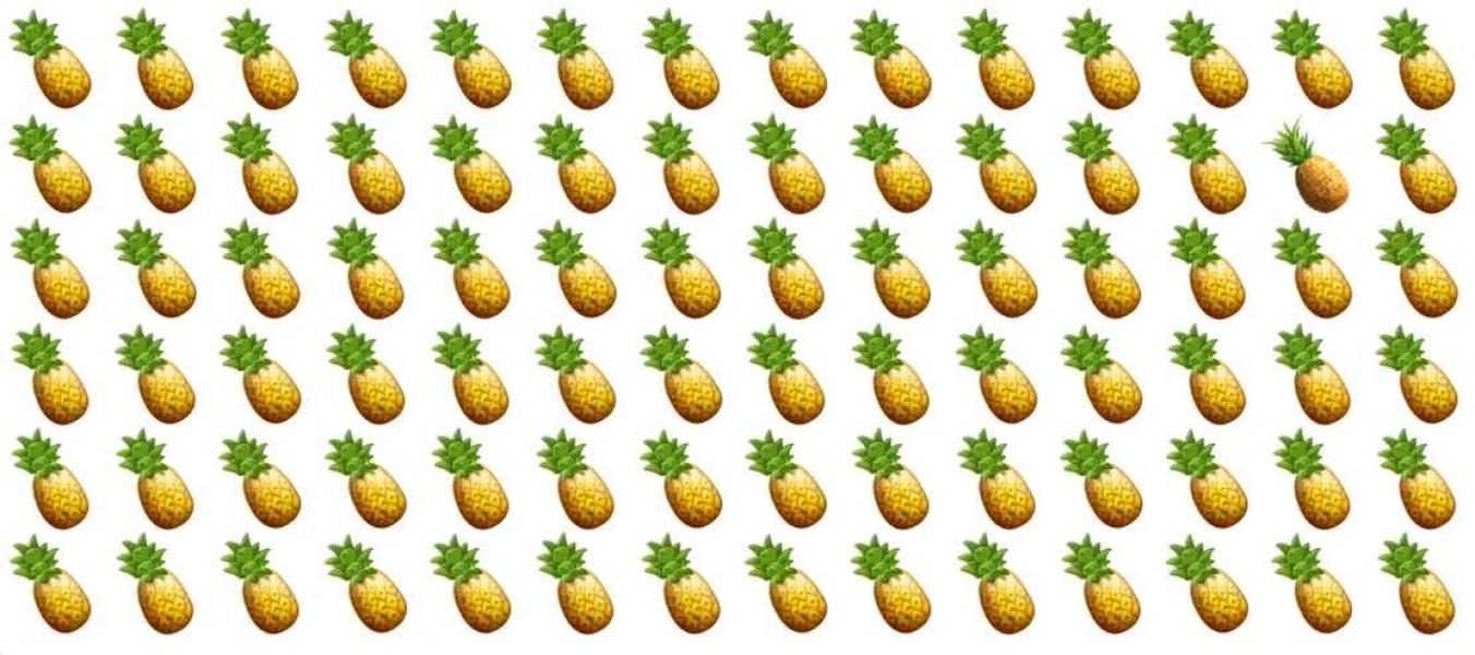 Vyřešte jednoduchou, ale velmi záludnou hádanku – musíte najít speciální ananas, který se liší od všech, které vidíte na obrázku.