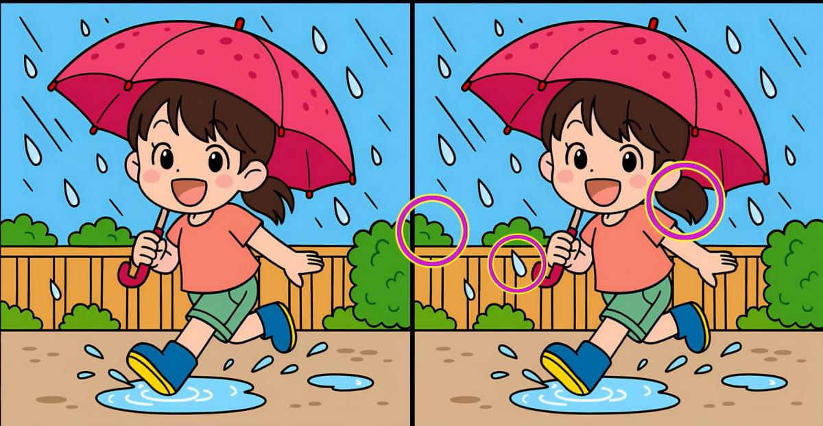 Tak co, jste připraveni na další výzvu? Podívejte se pozorně na dva obrázky dívky v dešti. Na první pohled mohou vypadat stejně, ale jsou mezi nimi tři malé rozdíly. Myslíte si, že je všechny najdete za 47 sekund? Zkuste to a otestujte svou ostrost zraku!
