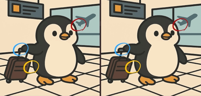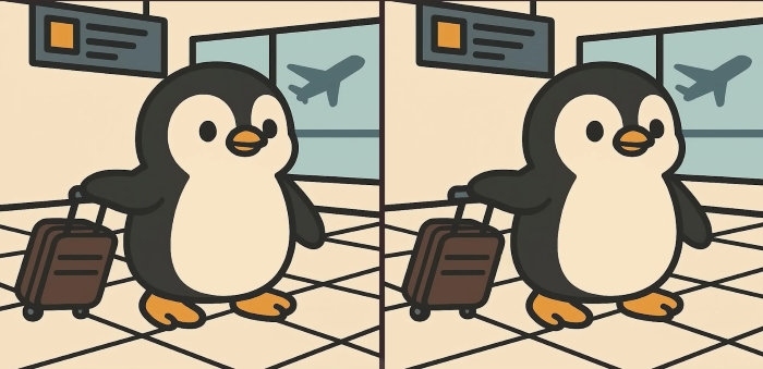 IQ test: najděte 3 rozdíly na obrázku tučňáka na letišti za 61 sekund