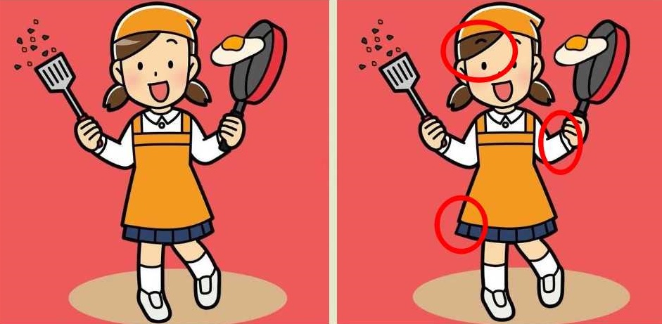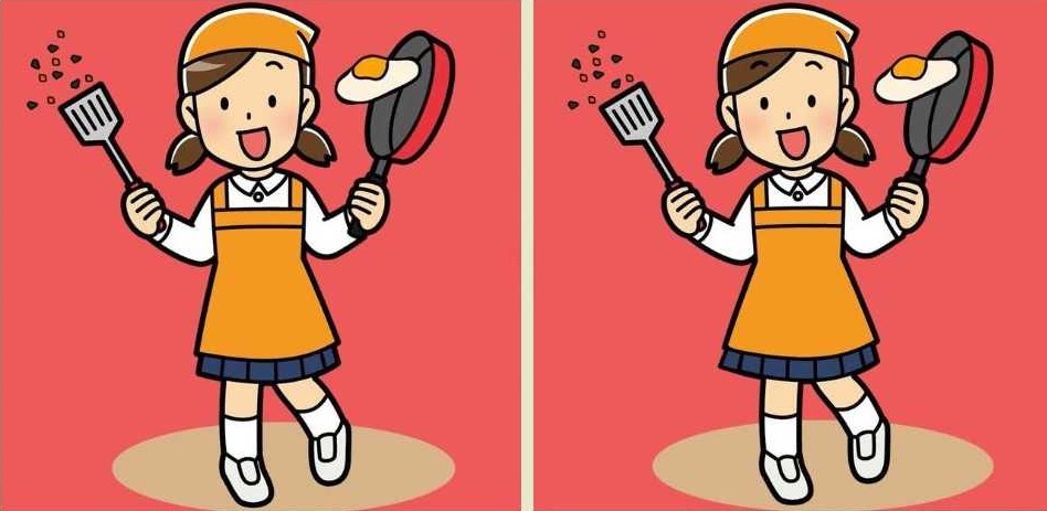Na obou obrázcích je dívka, která připravuje míchaná vajíčka. A zdá se, že má potíže, protože smažené vajíčko se z pánve chystá spadnout na zem.