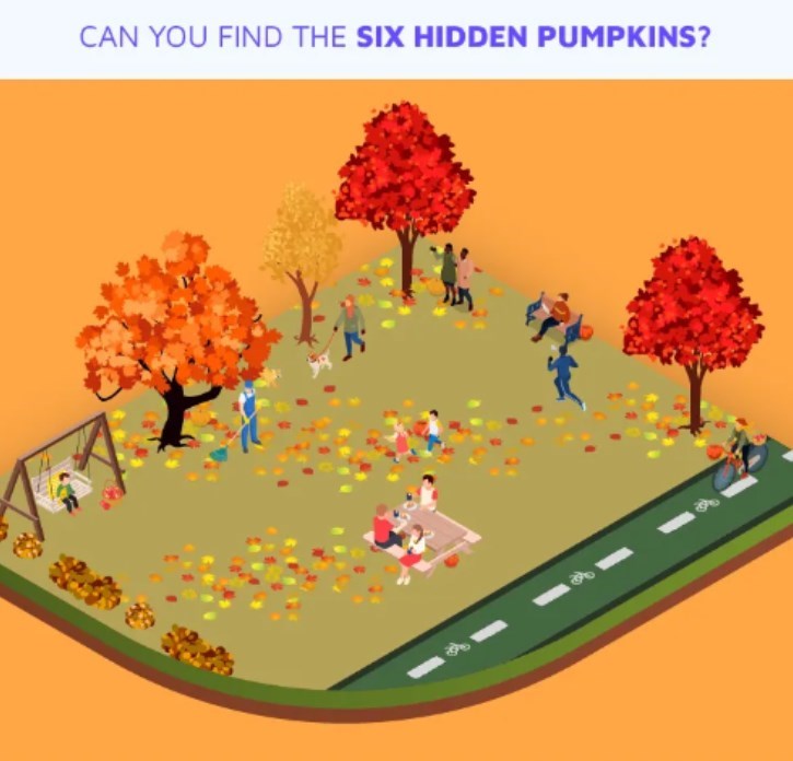 Musíte najít 6 dýní, na vyřešení úkolu máte 10 sekund. Pozorně si prohlédněte stromy a lidi na hřišti.