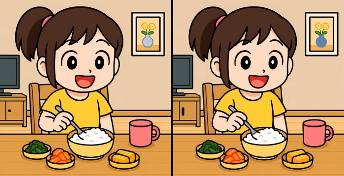Tak co, jste připraveni na zadání? Podívejte se pozorně na dva obrázky dívky u jídelního stolu. Na první pohled mohou vypadat stejně, ale jsou mezi nimi tři malé rozdíly. Myslíte si, že je všechny najdete za 49 sekund? Zkuste to a otestujte svou ostrost zraku!