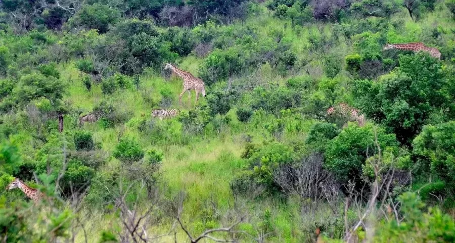 Vidíme skupinu zvířat, která se potulují mezi zelenými stromy a keři. Na obrázku je určitý počet žiraf a zeber. Spočítat jejich přesný počet však není snadný úkol. Některá zvířata jsou totiž jasně viditelná, ale zároveň některá z nich mohou být našim očím skryta.